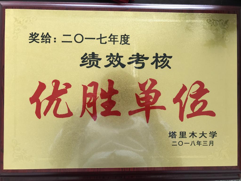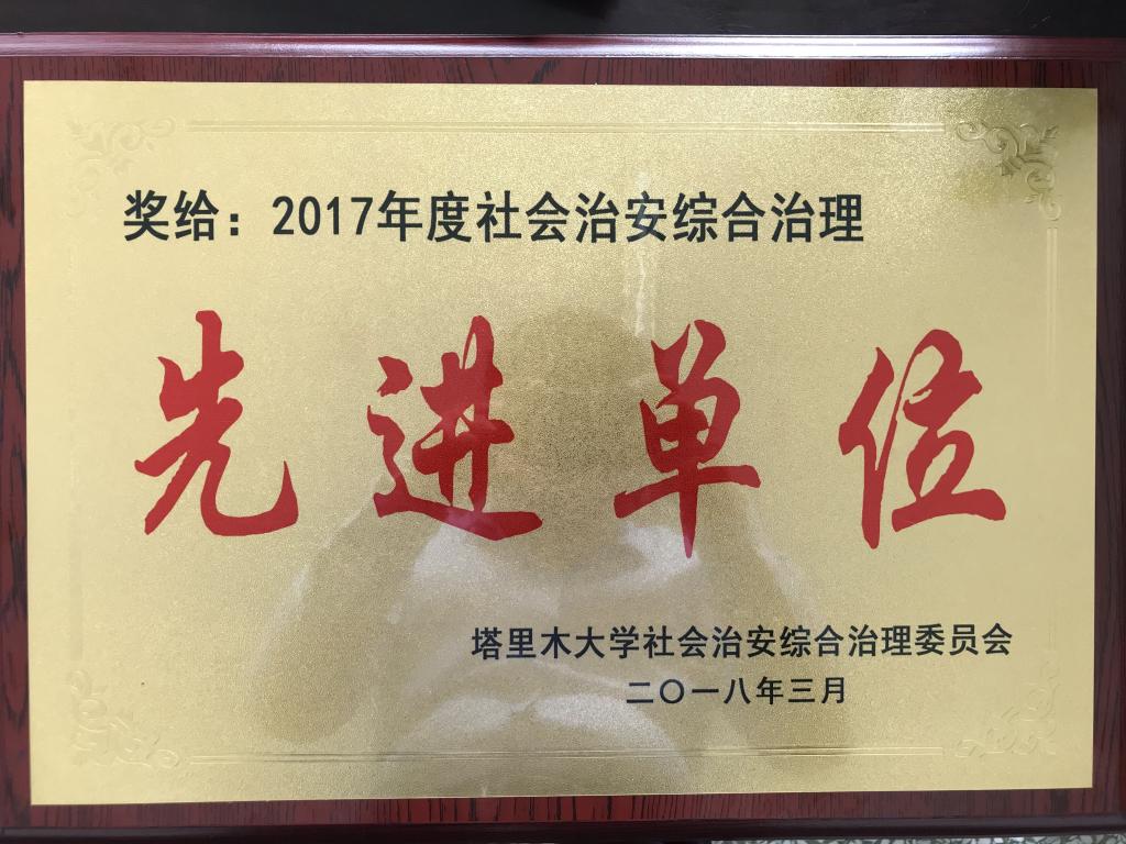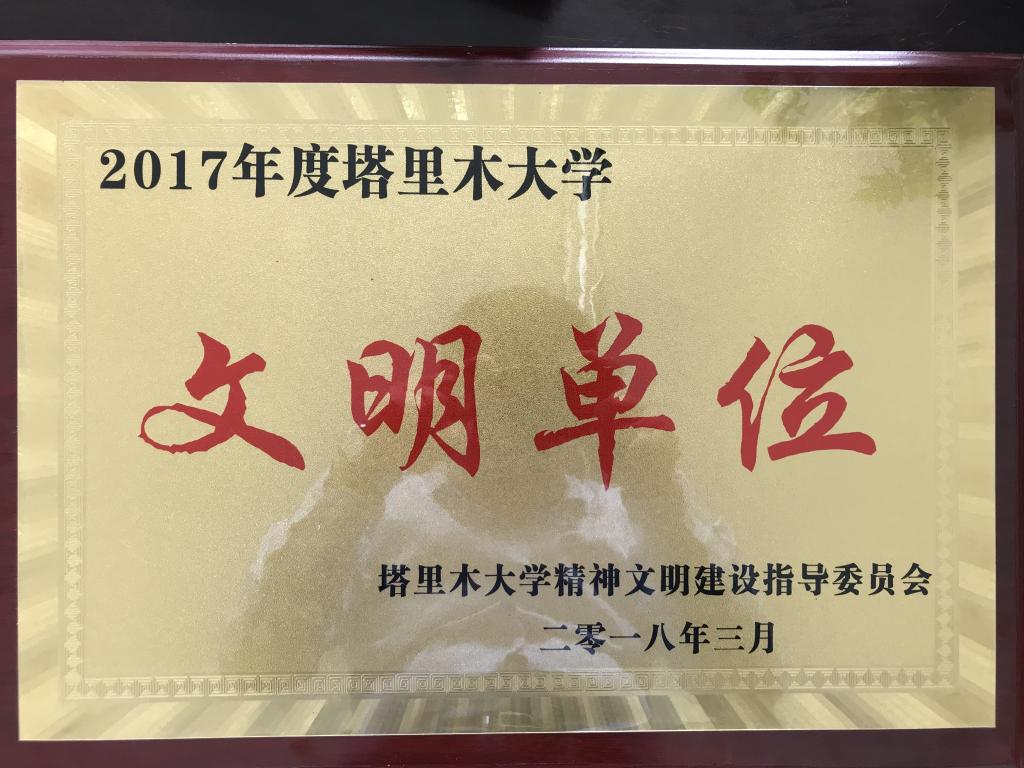 同时荣获2017年度塔里木大学文明单位、2017年度社会治安综合治理先进单位、2017年度绩效考核优胜单位三项荣誉称号。