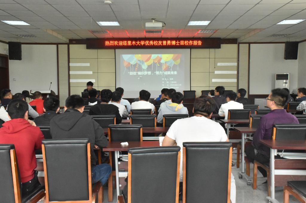 2014届优秀毕业生,同年考入东北农业大学硕博连读,被称为东北农业大学学霸级博士。在阔别5年后重返母校,见到学弟学妹们心情无比激动。他感谢老师们对自己的教育培养,更感恩母校对自己的信任。他结合自身多年学习和从事科学研究经历,作了题为《自信编织梦想,努力成就未来》的专题报告。报告从在塔里木大学的本科求学经历讲起,分享了自己在塔大学习和考研的经验,着重讲述了在东北农业大学参与各类科研项目的经历和如何通过查阅大量文献找到撰写学术论文的方法,同时也分享了面对压力和困惑自己是如何自我消化排解的。