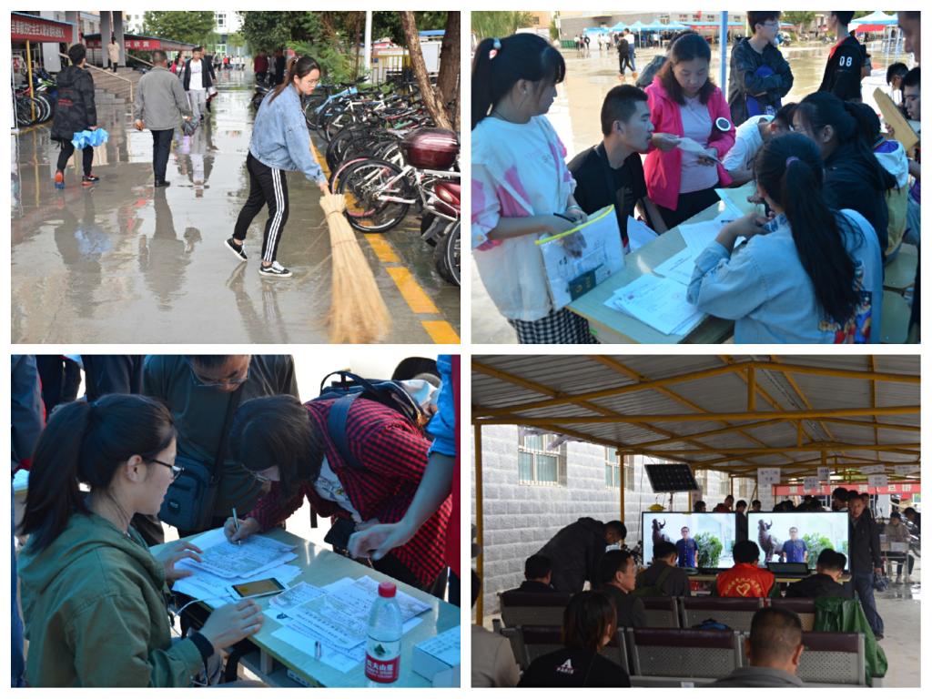在迎新现场,虽下着倾盆大雨,但依然阻止不了志愿者们热情地服务,有的帮新生拿行李,有的为新生及家长打伞,有的为新生做引导,有的为新生整理床铺……