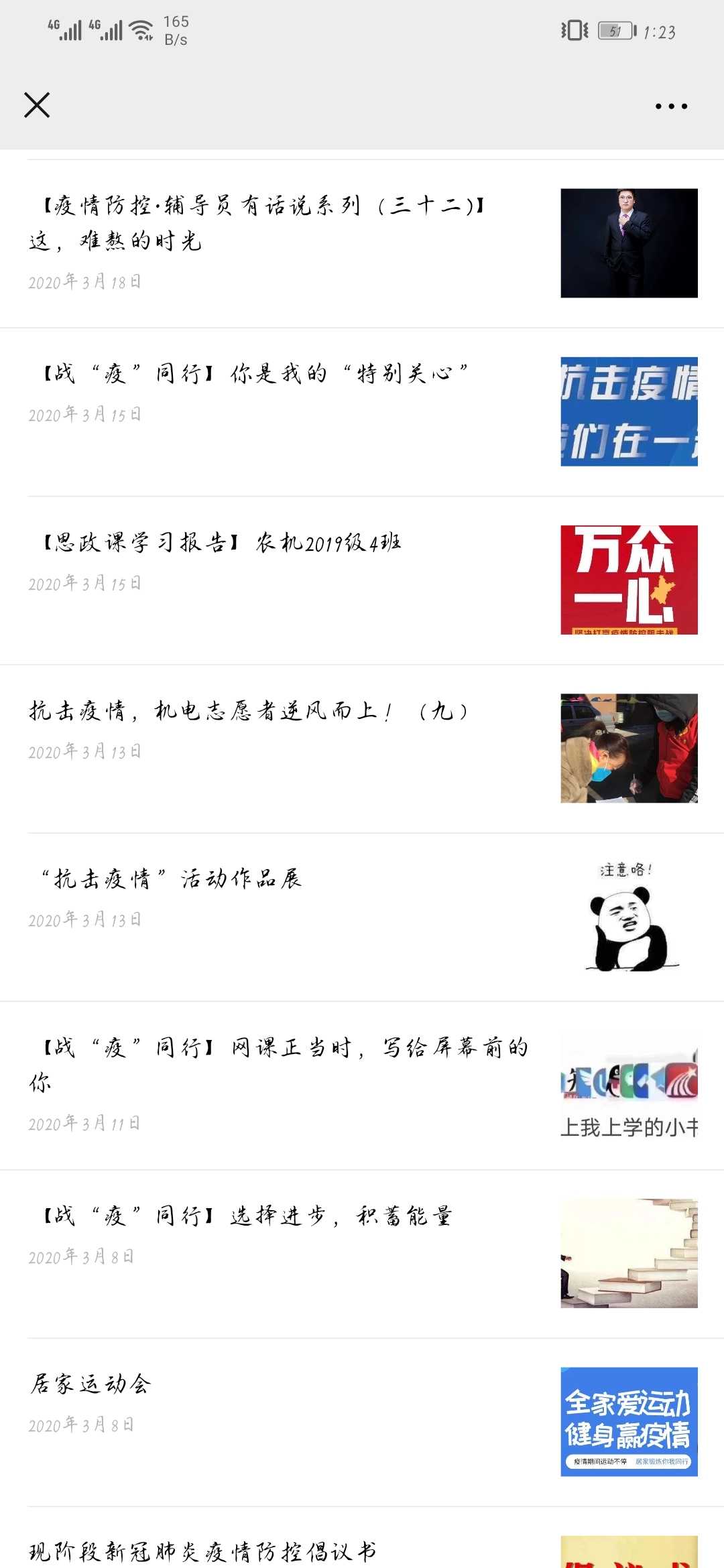 召开班长、团支书线上会议,增强责任感,规范学生干部的工作作风。提升综合测评,学生党支部开展主题党日活动,提高思想认识,发挥党员先锋模范作用。全体团支部开展“战役有我,青春同行”线上主题团日活动,引导各班级开展防疫知识学习、榜样力量宣传、志愿行动等。“机电微映象”微信公众号以“战疫同行”、“胡杨精神”、“抗击疫情、机电志愿者逆风而上”等系列推送,同学们积极参与各种线上学习、体育活动,全员参加全国大学生共上一堂思政课,递交感受体会等2300余份。展现出机电学子积极乐观、认真好学的精神面貌,坚定了学生抗击疫情的信心和认真学好网课的决心。