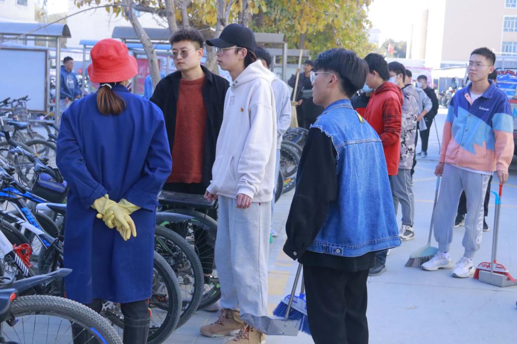 各位同学们热情高涨,大家分工合作,井然有序的完成了任务。一部分同学将垃圾清理干净,一部分将停放的车辆摆放整齐。