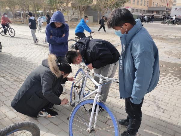 志愿者们分成两组,一组负责在西区大舞台以及西区二号食堂附近向来往的学生分发宣传页,普及自行车、电动车维护与保养的相关小知识,为此次志愿服务活动做宣传;另一组负责维护自行车和电动车,并根据需要为自行车和电动车打气、上润滑油等。