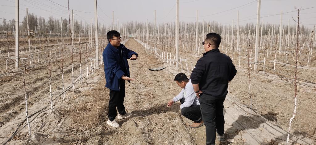3月13日,绿肥种植科技服务团队专家团成员一行又赶到第三师44团9连的果园开展绿肥种植调研工作,为果农下一步播种绿肥提供技术指导和机具作业支持。