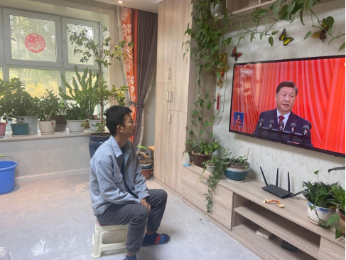 教师在家收看党的二十大直播盛况。