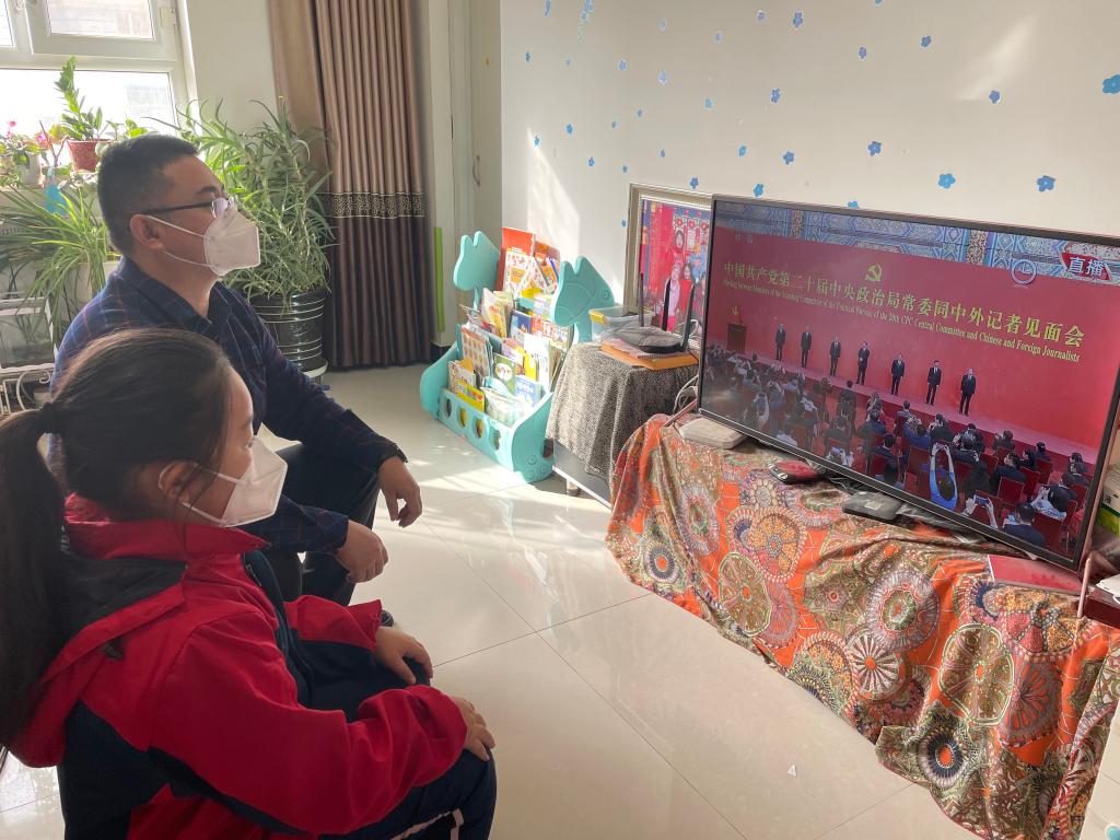 李勇及家属在塔大38号楼1-142观看新一届中央政治局常委中外记者见面会