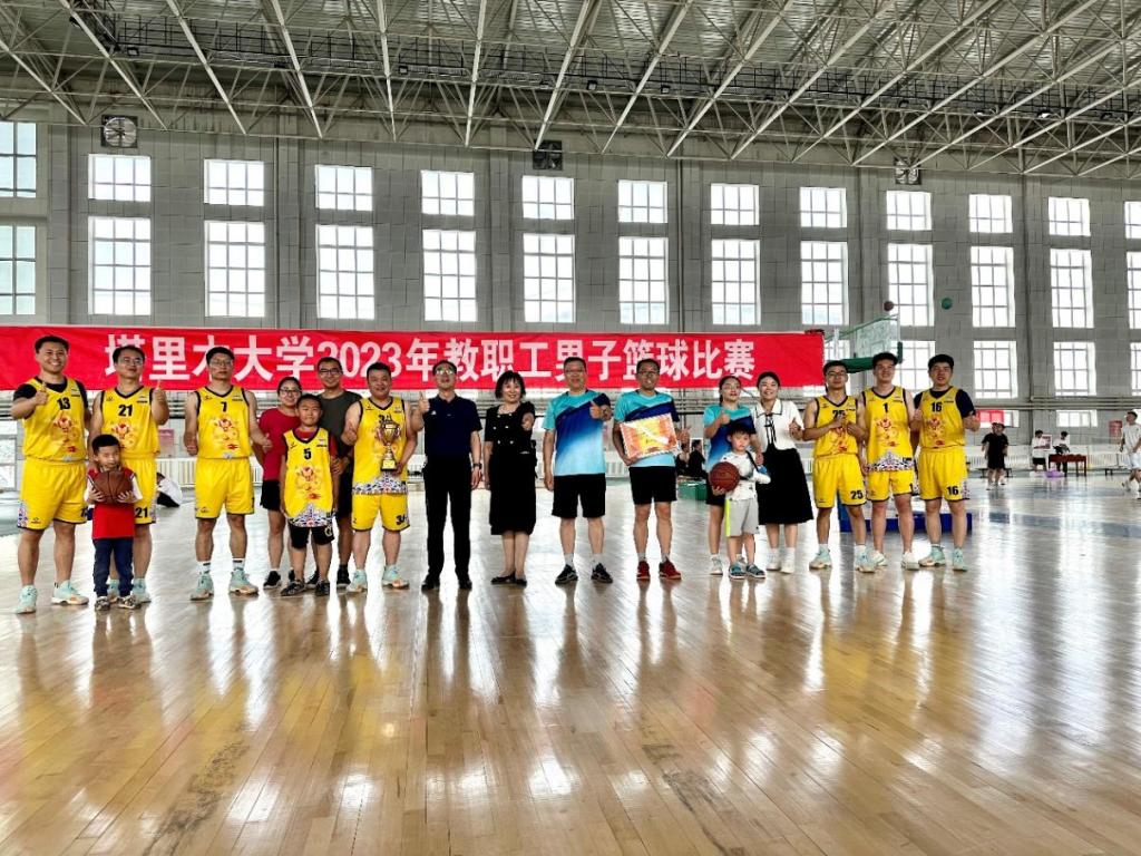 教职工组成的篮球队在比赛中荣获第一名的成绩,张爱萍校长为机电院男篮队伍送上冠军奖杯,并表示祝贺。