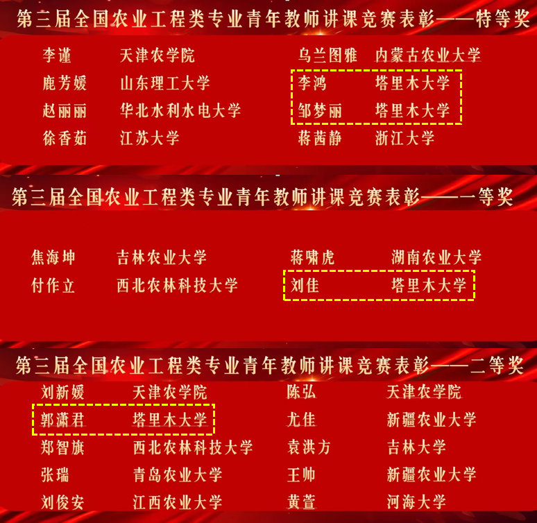 10月14日,第三届全国农业工程类专业青年教师讲课竞赛在天津举行。来自浙江大学,中国农业大学,西北农林科技大学,西南大学,华中农业大学等48所高校的73名教师参加了本次比赛。经过激烈角逐,塔里木大学机电lol博彩