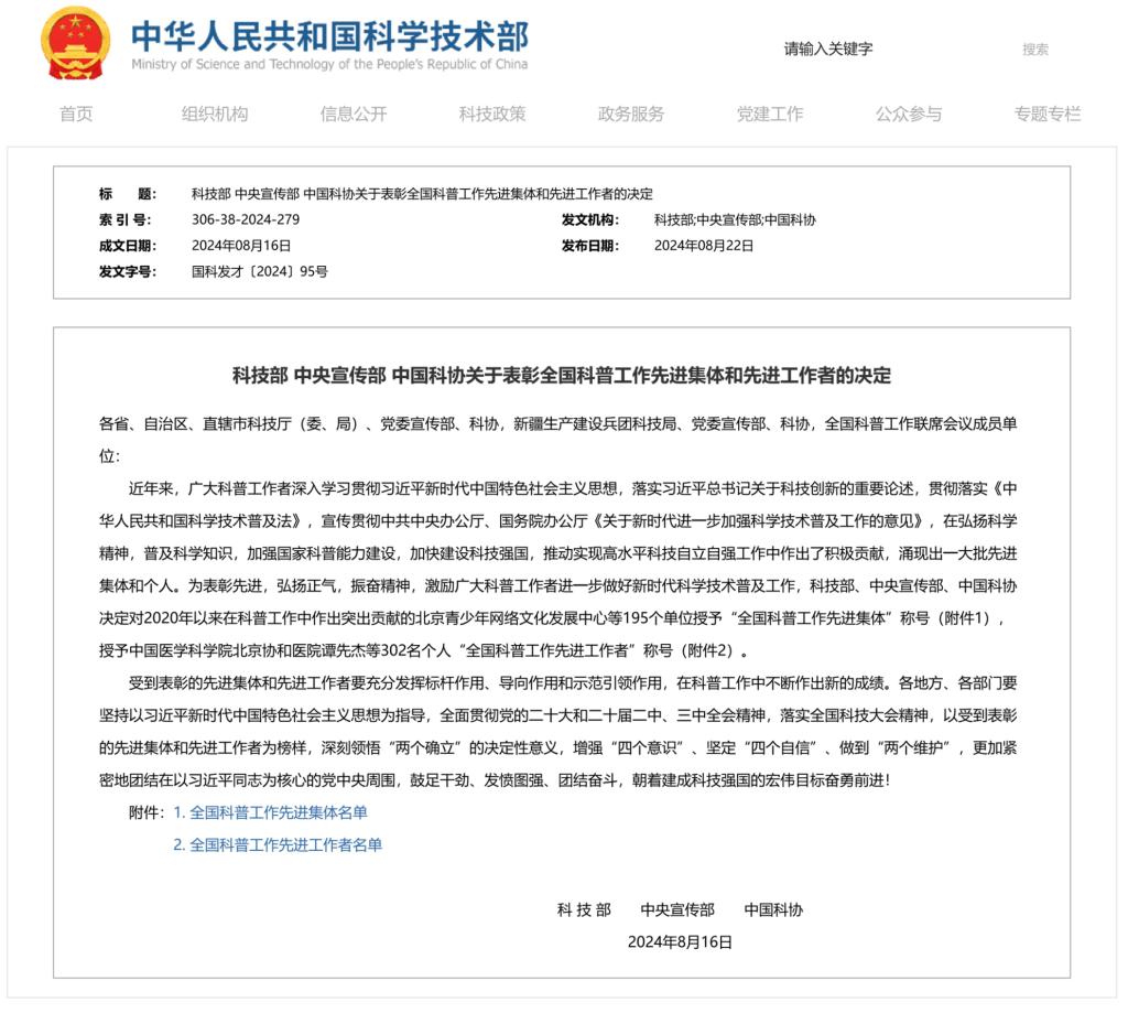 近日,科技部、中央宣传部、中国科协发布《关于表彰全国科普工作先进集体和先进工作者的决定》,对2020年以来在科普工作中作出突出贡献的195个单位和302名个人授予“全国科普工作先进集体”和“全国科普工作先进工作者”荣誉称号。其中,lol博彩-lol博彩平台