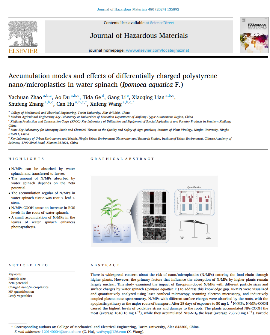 残膜污染防治团队在植物吸收微/纳米塑料方面取得最新研究进展,揭示了植物吸收微/纳塑料条件与转运过程。该成果于2024年9月19日以“Accumulation modes and effects of differentially charged polystyrene nano/microplastics in water spinach (Ipomoea aquatica F.)”为题发表在国际环境科学领域顶级学术期刊《Journal of Hazardous Materials》(IF 13.6,中科院一区),我校为第一单位。通讯作者为我校青年教师胡灿博士与王旭峰教授。团队2022级农业工程硕士研究生赵亚川为第一作者。