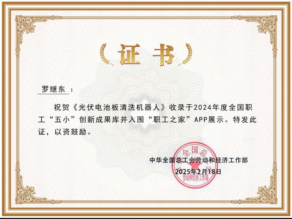 教师罗继东作品《光伏电池板清洗机器人》收录于全国职工“五小”创新成果库并入围“职工之家”APP展示。这是我校首项作品收录进入全国职工“五小”创新成果库。