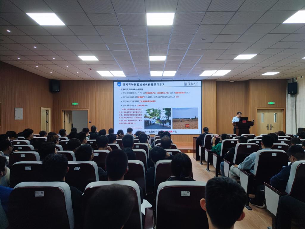 报告中,杨然兵教授对种子是保障国家粮食安全和实现农业现代化战略制高点的根本力量,田间育种包括育种、繁种、制种三个阶段。针对我国不同区域粮食作物育制繁种农艺要求,从技术研发和装备研制两方面,对育制繁种播前收后精选分级、播种、去雄授粉、父本去除、收获和信息管控等方面全程机械化研发进展进行详细阐述,并从数字化、智能化、信息化等方面对田间育种试验进行展望。本次报告不仅给与会的老师和学生指明了我国农业研发的方向,也让与会的学生从多维的角度思考研究选题,从而找准自己的目标,精准发力。