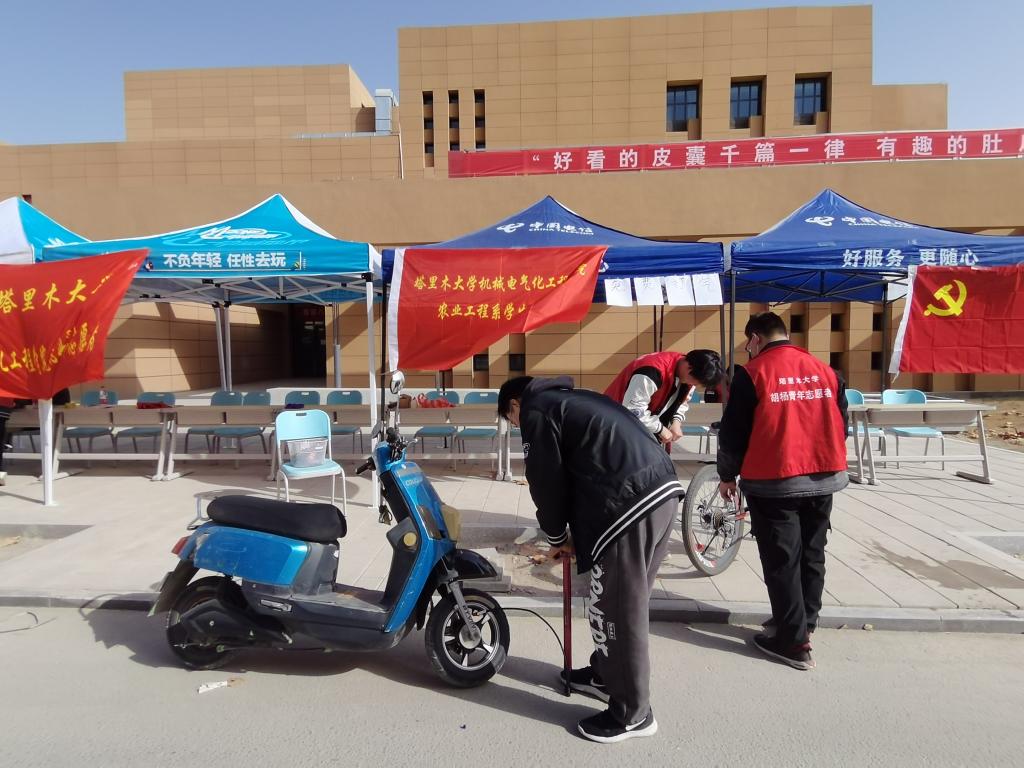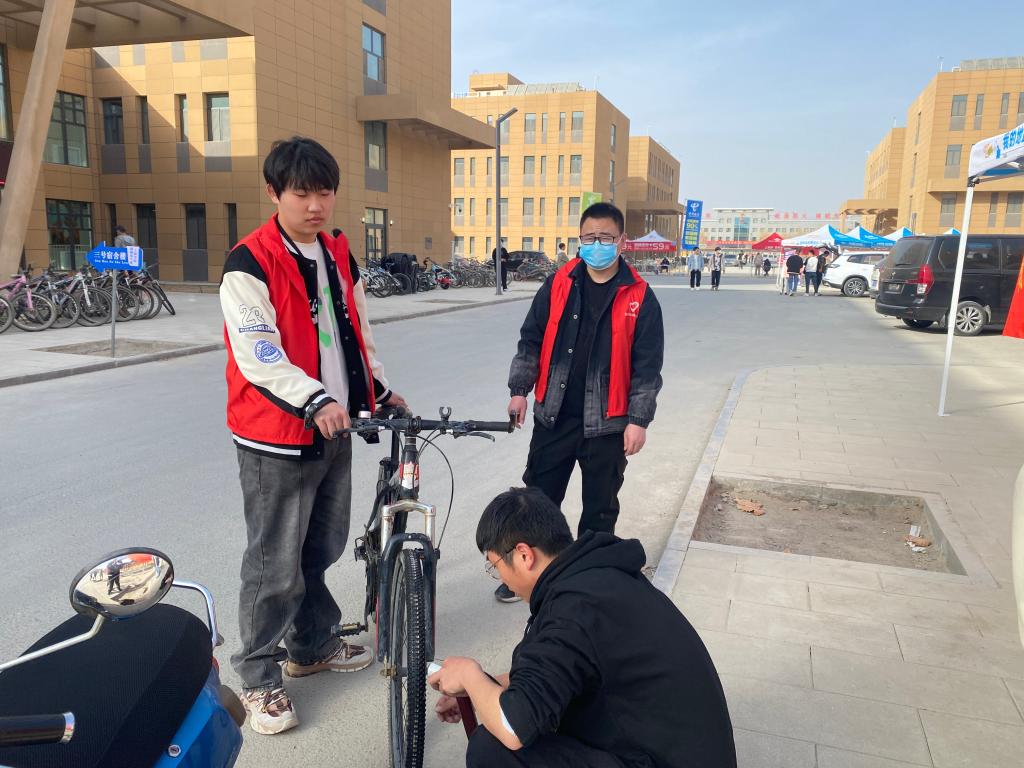 志愿者们分成两组,一组负责向来往的学生分发宣传页,普及自行车、电动车维护与保养的相关小知识,为此次志愿服务活动做宣传;另一组负责维护自行车和电动车,并根据需要为自行车和电动车打气、上润滑油等。