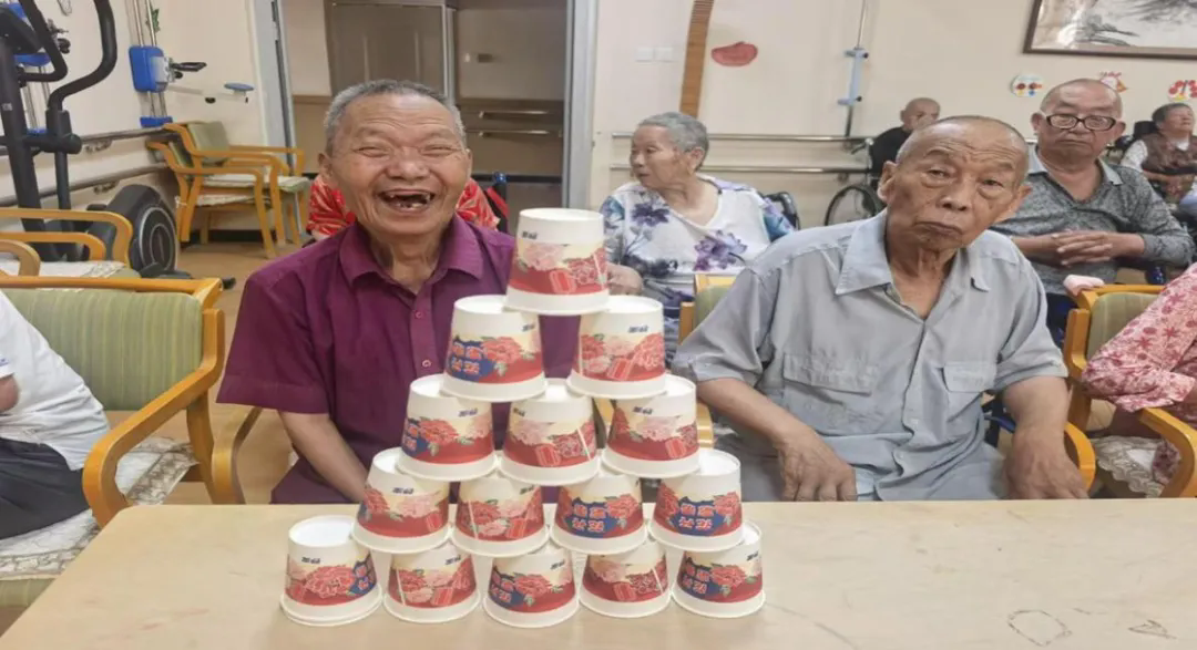 队员们一到养老院,便迅速展开行动:精心布置场地,取出早已备好的纸杯,热情邀请老人们参与这场叠杯游戏。老人们围坐成圈,眼中闪烁着好奇与期待的光芒。游戏开始后,队员首先示范如何用纸杯叠出各种造型,老人们学得全神贯注,很快便纷纷动手尝试。只见一双双布满岁月痕迹的手灵活地摆弄着纸杯,不一会儿,桌上便呈现出各式创意造型:有的叠成高塔,仿佛寄托着对生活步步高升的美好期许;有的摆成小房子,承载着对家的温暖眷恋。整个过程中,老人们脸上洋溢着孩童般的笑容,现场充满了欢声笑语。